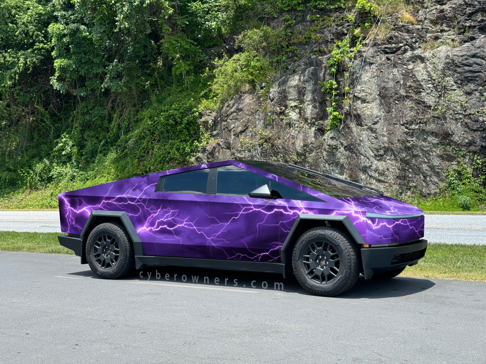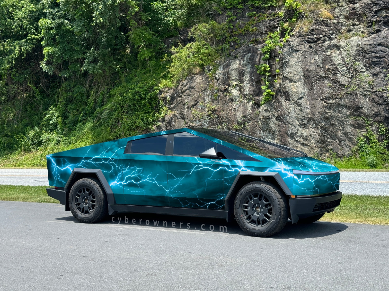 Wrap design for Tesla Cybertruck that looks like blue lightning in storm clouds